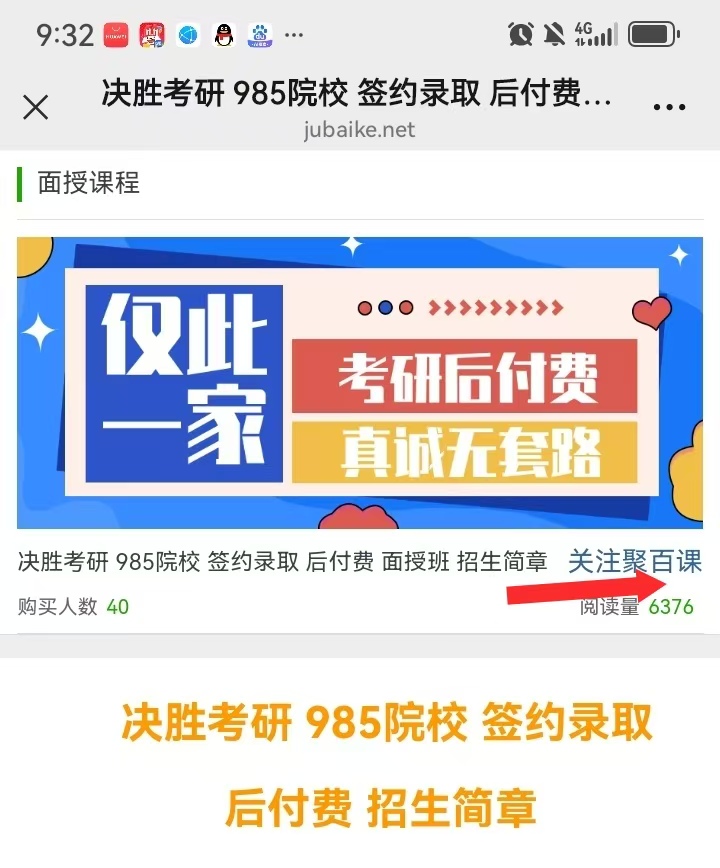 1.首先需要关注本公众号,点击本页面最上侧的长图右下角的“关注聚百课”(如下图红箭头),显示二维码后扫码关注: